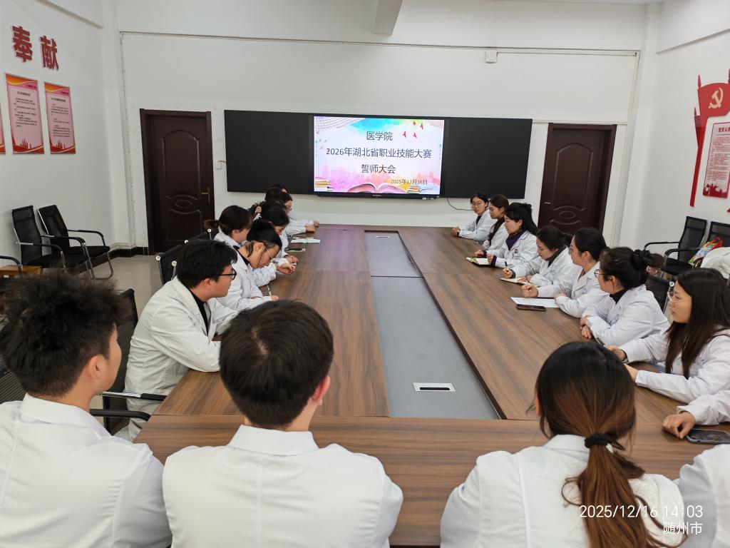 为凝聚师生力量,鼓舞参赛士气,明确备战方向,确保在2026年“中银杯”湖北省职业院校技能大赛中取得优异成绩,12月16日下午14:00,医学院在会议室隆重召开赛前誓师大会。冯院长、金院长、教研室琚主任、全体指导老师及参赛学生共同参会。