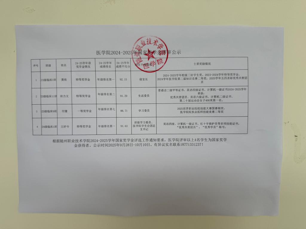 本着“公平、公正、公开”的原则,医学院根据学校相关规定,经个人申请,班级推荐,从本院符合报名条件的同学严格筛选,经过学院审核,拟推荐黄欣、田力文、付豪、王妤兮4名同学申请2023-2024学年国家奖学金,现将名单公示如下: